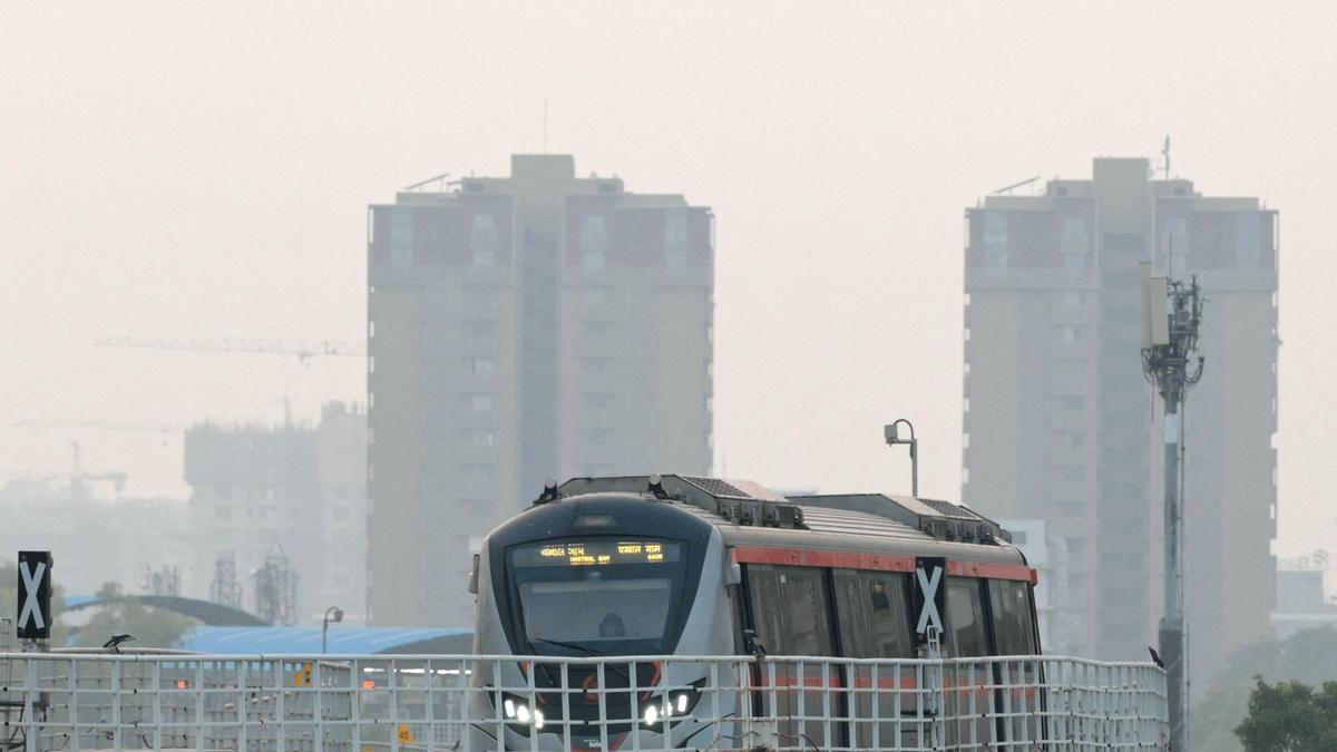 A metro train runs amid smoggy conditions a day after the Hindu festival of Diwali in Ahmedabad on October 21, 2025.
