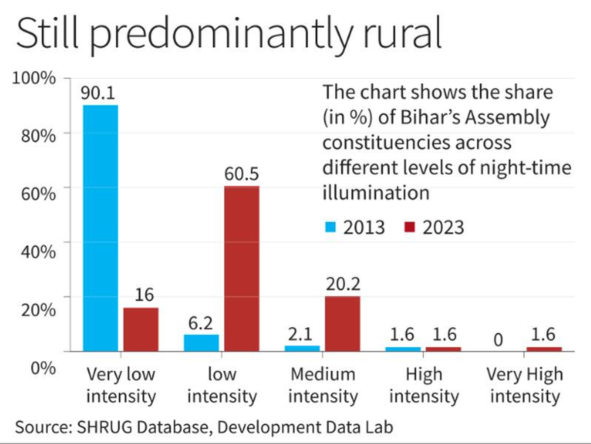 The chart shows the share of Bihar’s Assembly constituencies across different levels of nighttime illumination — very low and low (mostly rural and some semi-rural areas), medium (semi-rural and semi-urban areas), and high and very high (largely semi-urban areas and cities) — in 2013 and 2023.